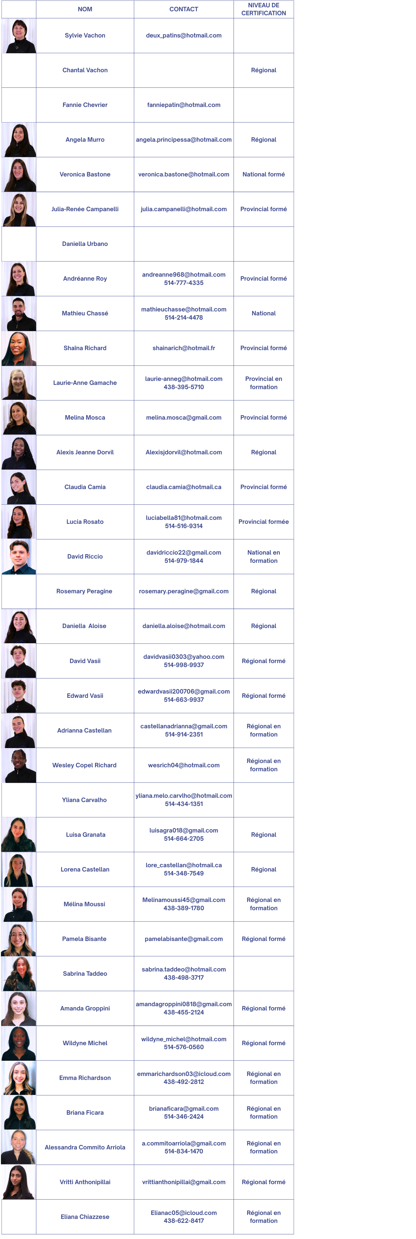 Voici la liste de nos entraîneurs en ordre d'ancienneté. Veuillez communiquer avec les entraîneurs selon le courriel ou téléphone selon le cas.